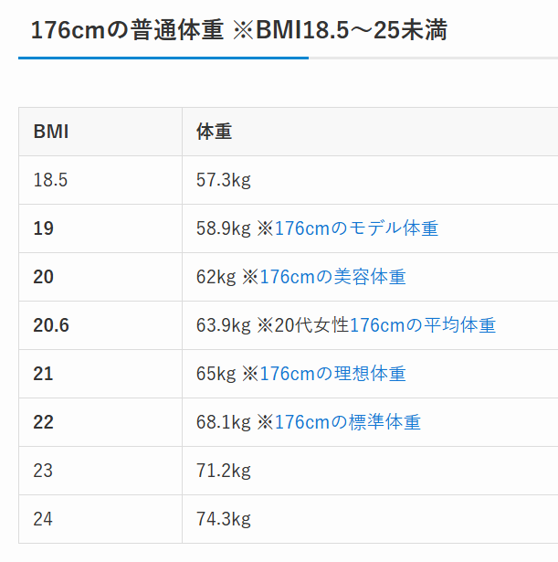 そんな塚本高史さんの身長は176㎝とのことですが、176㎝の方のBMIを調べてみました。